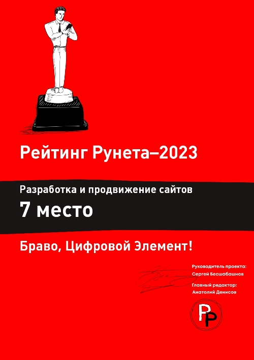 Год от года компания «Цифровой Элемент» оказывается в топе лидеров отрасли, а это значит, что мы повышаем уровень качества услуг, развиваем технологии разработки и можем конкурировать с крупными компаниями по всей России.