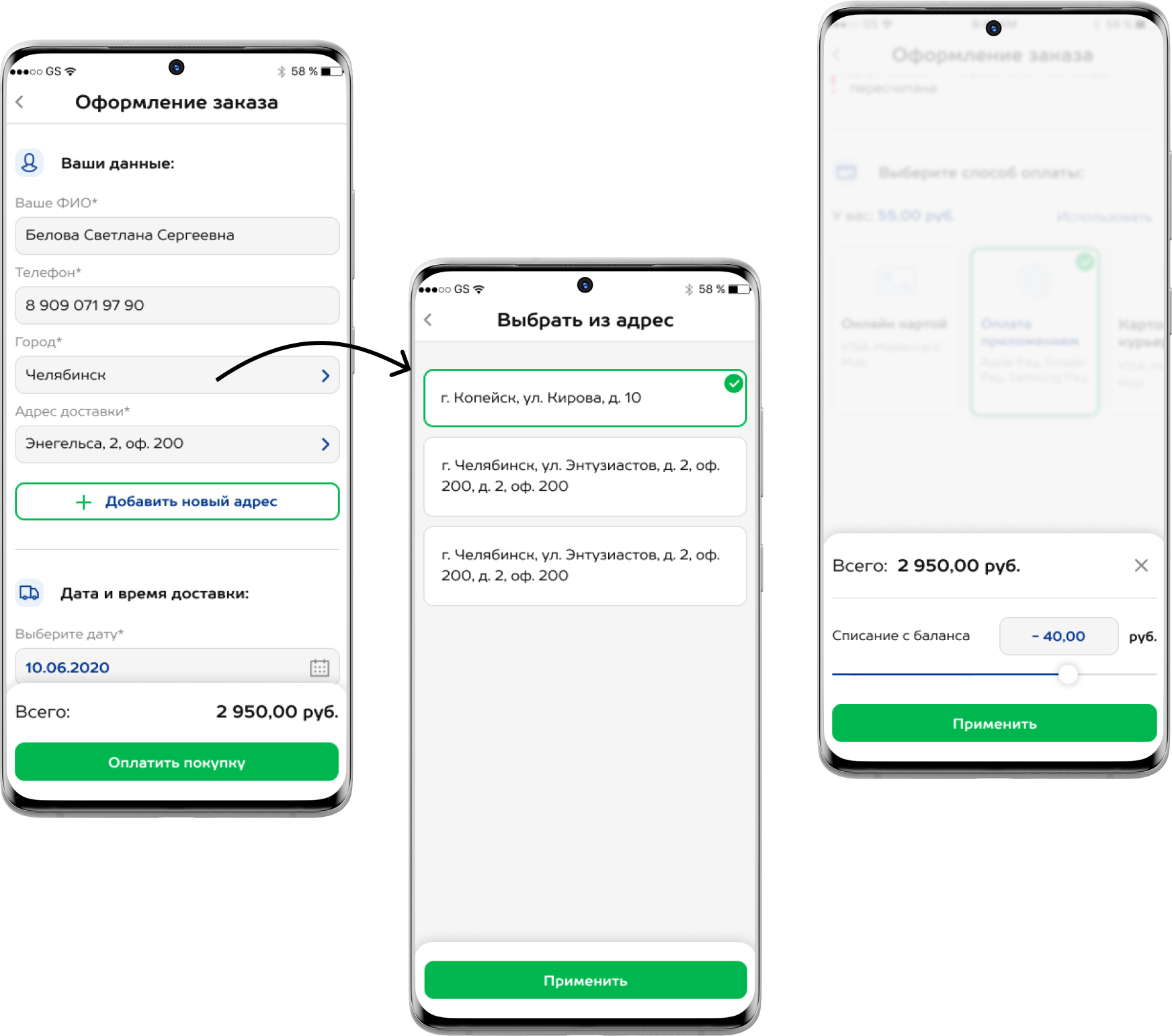 • Выбор способа оплаты (онлайн картой, оплата приложением через Applypay или GooglePay, курьеруом банковской картой, курьеру наличными или по счету на оплату).